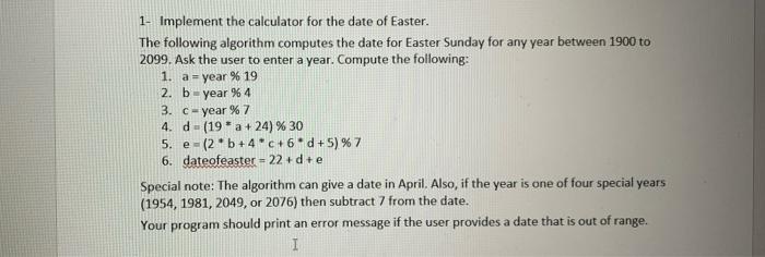 Solved 1 Implement The Calculator For The Date Of Easter Chegg Com