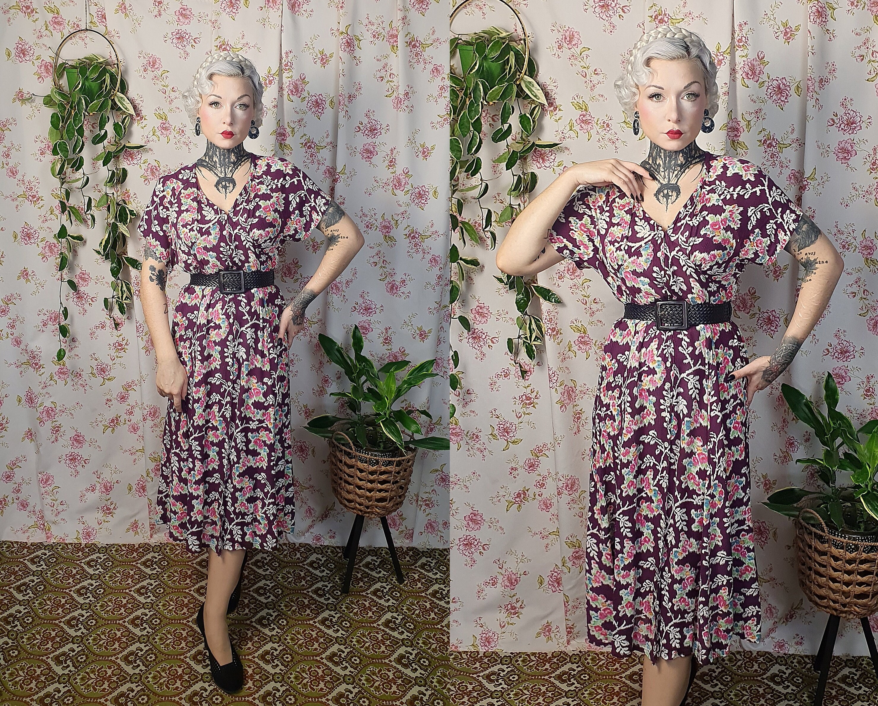 As Is Vintage Burgundy White Floral Print Rayon Crepe Romantic Long Swing Dress Uk 8 10 1940s 1950s Style 80s Does 40s Floral Dress Etsy